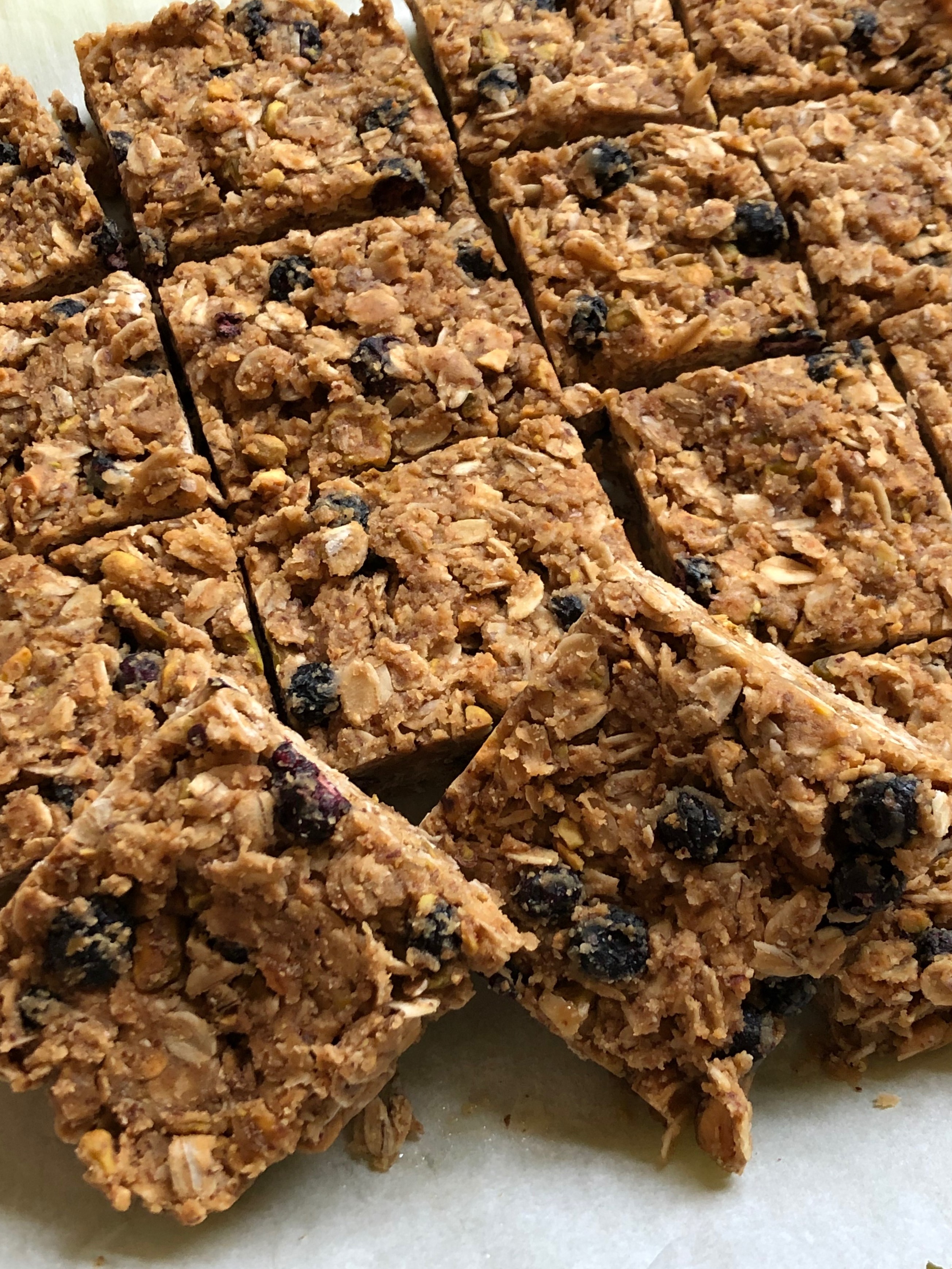 While oats bake, mix nut butter of choice and syrup in a bowl. Stir in chopped pistachios, cooled oats, flax seed and salt. Carefully stir in blueberries. Spread mixture into a 8 inch square pan lined with parchment paper. Press firmly and evenly into pan. Refrigerate about 1 hour, cut and enjoy.
