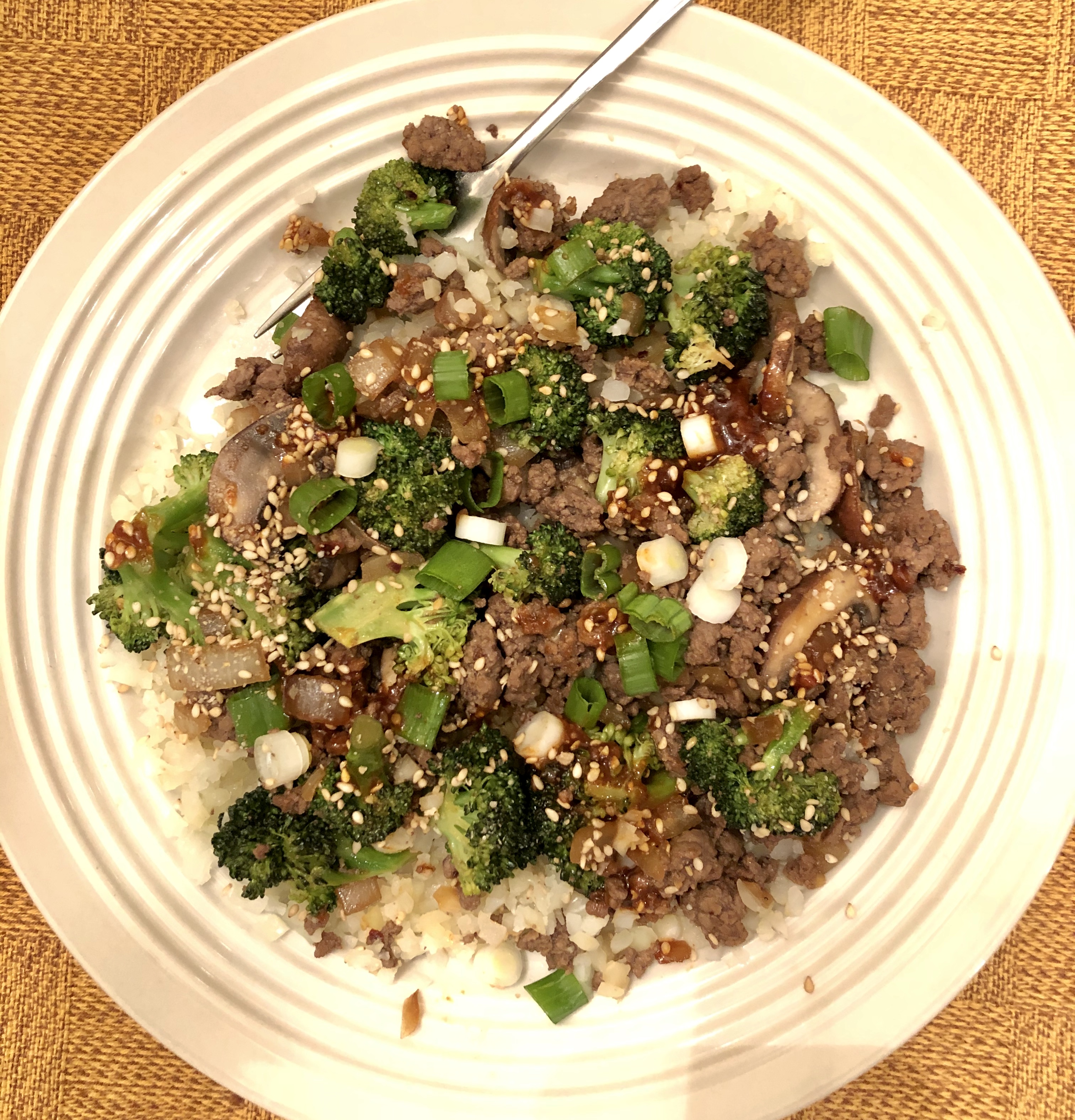 Divide cauliflower rice over 4 bowls, add beef and broccoli/mushrooms. Top with Gochujang on each, sesame seeds, scallions and kimchi.