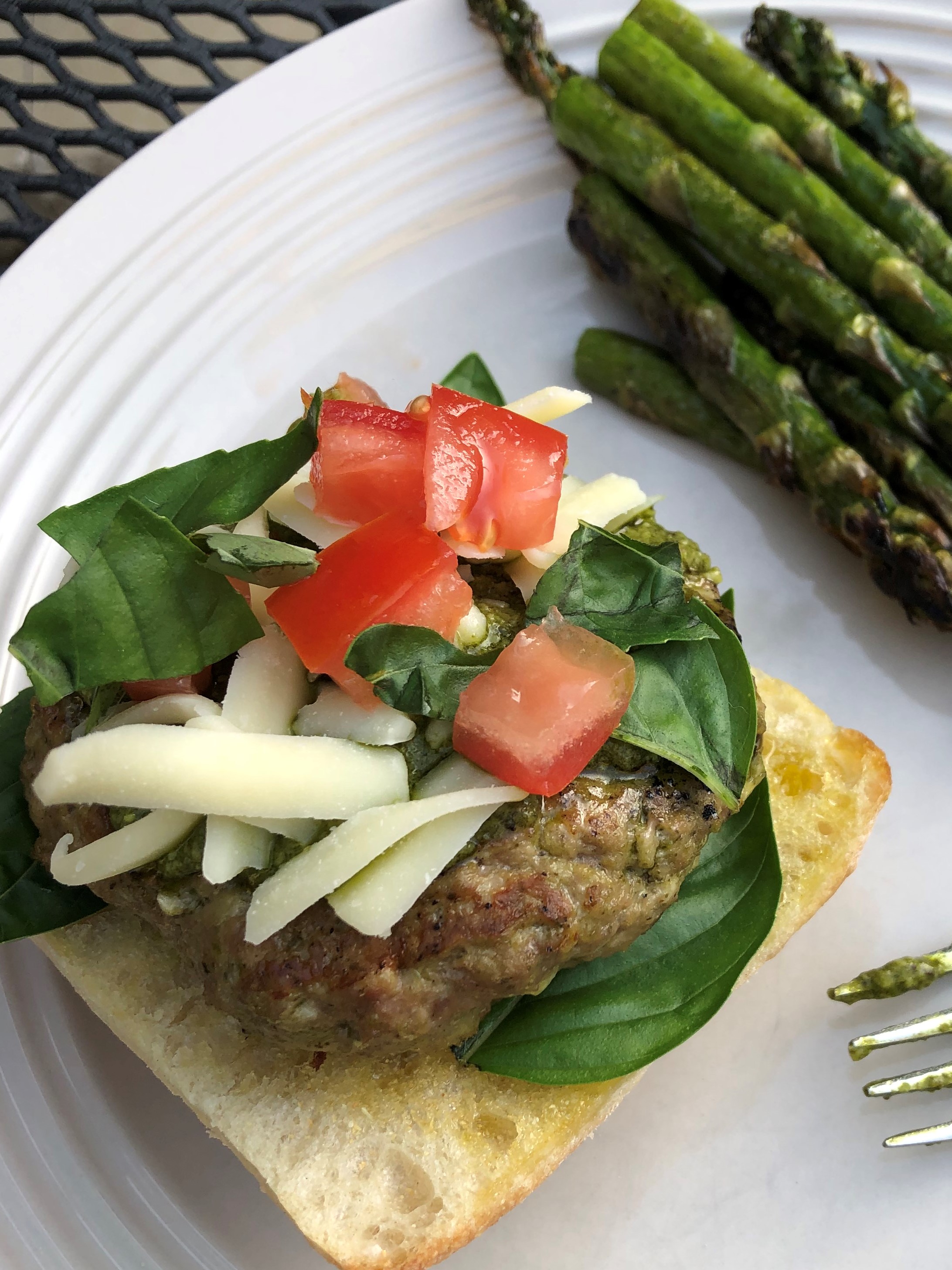 In large bowl combine the chicken or turkey, 2 Tbsp of the Pesto (note this is 1/2 the amount noted above), Parmesan cheese, garlic, salt and pepper. Gently combine and then shape into 4 patties.