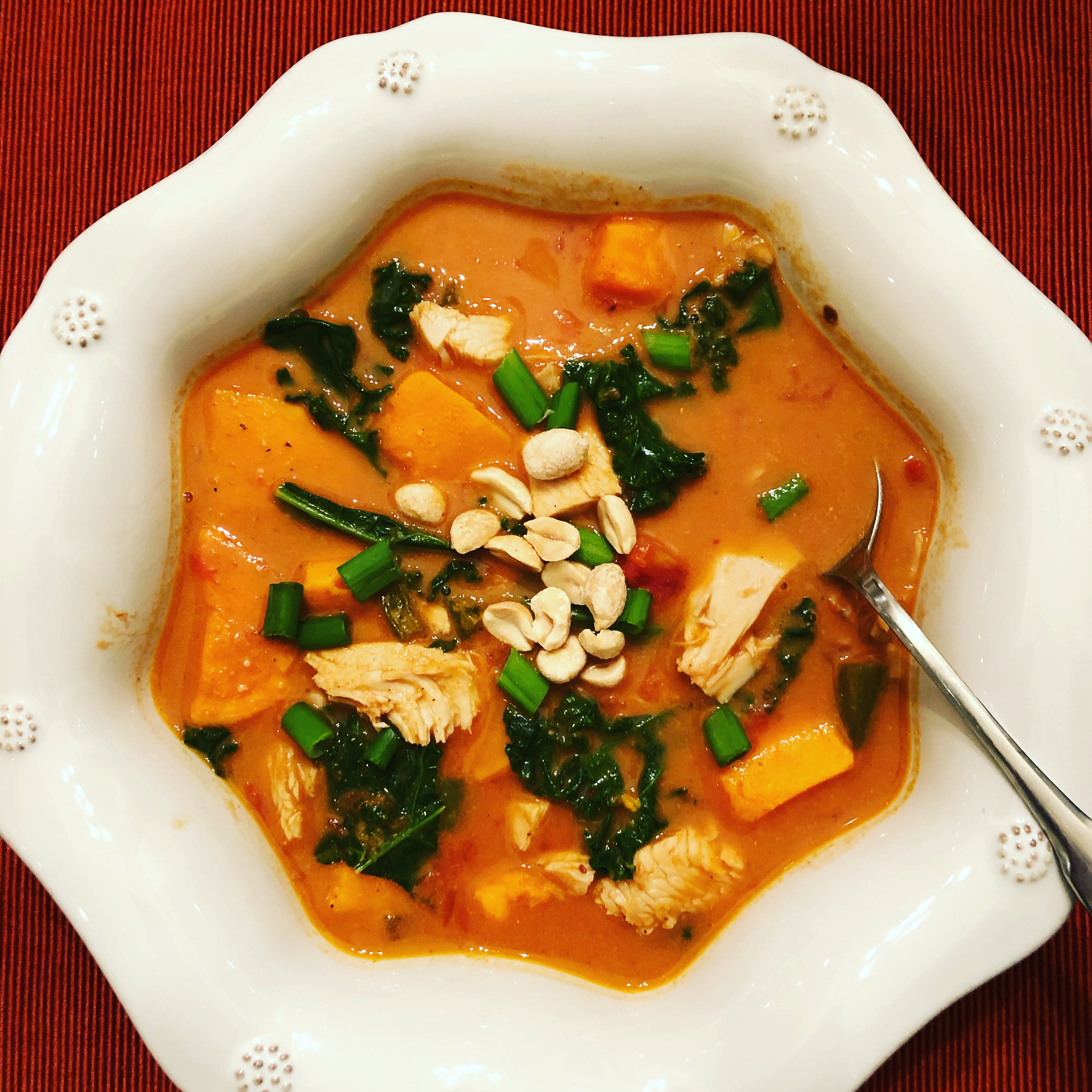 Add Turkey, peanut butter mixture and crushed tomatoes to Dutch oven and cook over medium-low heat, covered, for 5 minutes. Remove cover, add Kale and cook on low for 2 to 3 more minutes. Serve in bowls topped with green onion tops and crushed salted peanuts.